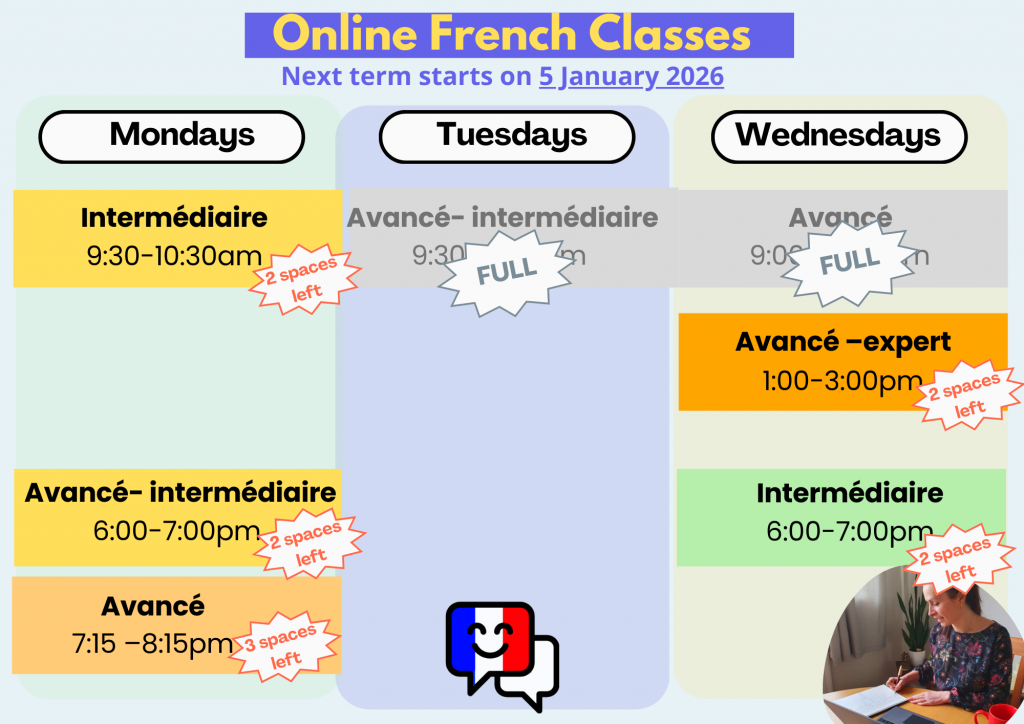 Intensive Advanced French – 9:00-11:00AM– FULLY BOOKED!- Intensive Expert- Advanced French – 1:00-3:00PM- Only 2 spaces left